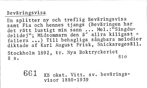 //// Beväringsvisa //// En splitter ny och treflig Beväringsvisa samt Fia och hennes tjängs (Beväringen har det rätt lustigt min sann ... Mel.:"Singdu-delidej"; Midsommarn den ä' allra kiligast -fallera ...) Till behagliga sångbara melodier diktade af Karl August Frisk, Snickaregesäll. //// Stockholm 1892, tr. Nya Boktryckeriet 8 s. 8:0 //// 61.8 KB okat. Vitt. sv. bevärings- //// visor 1880-1939 ////
