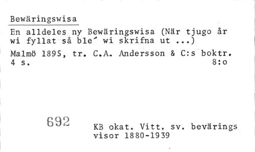 //// Bewäringswisa //// En alldeles ny Bewäringswisa (När tjugo år wi fyllat så ble" wi skrifna ut ...) //// Malmö 1895, tr. C.A. Andersson & C:s boktr. 4 s. 8:0 //// 61.8 KB okat. Vitt. sv. bevärings- //// visor 1880-1939 ////