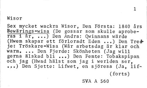 //// 1 //// Wisor //// Sex mycket wackra Wisor, Den Första: 1840 års Bewärings=wisa (De gossar som skulle aprobe-ras i år, ...) Den Andra: Qwinnans wärde (Hwem skapar ett förloradt Eden ...) Den Tredje: Tröskare=Wisa (Wår arbetsdag är klar och warm. ... Den Fjerde: Skönheten (Jag will gerna älskad bli ...) Den Femte: Tobakspipan och jag (Hwad hälst som jag i werlden ser, •••) Den Sjette: Lifwet, en sjöresa (Ja, lif- //// (forts) //// SVA A 560 ////