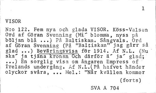 //// 1 //// VISOR //// N:o 122. Fem nya och glada VISOR. Köss-Valsen Ord af Göran Svenning (Mi" blomma, nyss på böljan blå ...) På Baltiskan. Sångvals. Ord af Göran Svenning (På "Baltiskan" jag gårr så glad ...) Beväringsvisa för 1914. Af N.L. (Nu " ska" ja tjäna kronan "Och därför ä" ja" glad; ...) En sorglig visa om ångaren Empress of Irelands undergångé Af N.L.^På hafvet händer olyckor svåra, ... Mel.: "När kvällen kommer //// (forts) //// SVA A 704 ////
