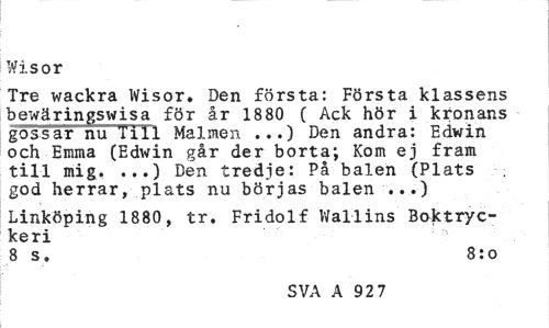 //// Wisor //// Tre wackra Wisor. Den första: Första klassens bewäringswisa för år 1880 ( Ack hör i kronans gossar nu Till Malmen ...) Den andra: Edwin och Emma (Edwin går der borta; Kom ej fram till mig. ...) Den tredje: På balen (Plats . god herrar, plats nu börjas balen ...) //// Linköping 1880, tr. Fridolf Wallins Boktryckeri //// 8 s. 8:o //// SVA A 92 7 ////