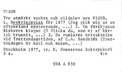 //// VISOR //// Tre utmärkt vackra och alldeles nya VISOR. 1. Beväringsvisa för 1877 (Jag gick mig ut en aftonstund spatserande, ...) 2. En förskjuten älskares klagan (0 flicka du, som ej af kärlek brunnit, ...) 3. En rumlares betraktelse vid Trettondagstiden, af C.A. Sandstén (Trettondagen är kall och mulen, ...) //// Stockholm 1877, tr. E. Svenssons Boktryckeri 8 s. 8:o //// SVA A 9 38 ////