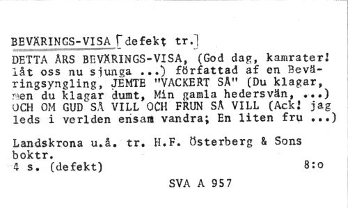 //// BEVÄRINGS-VISA [defekt tr.] //// DETTA ÅRS BEVÄRINGS-VISA, (God dag, kamrater* låt oss nu slunga .»0 författad af en Bevä-ringsyngling, JEMTE "VACKERT SÅ" (Du klagar, men du klagar dumt, Min gamla hedersvän, ...) OCH OM GUD SÅ VILL OCH FRUN SÅ VILL (AckJ jag leds i verlden erisa» vandra; En liten fru ...) //// Landskrona u.å. tr. H.F. österberg & Sons boktr. //// 4 s. (defekt) 8:0 //// SVA A 95 7 ////
