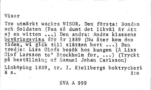 //// Wisor //// Tre utmärkt wackra WISOR. Den första: Bonden och Soldaten (Fan så dumt det likväl är Att ej en witten Den andra: Andra klassens //// beväringsvisa för år 1839 (Nu åter kom den tiden, wi gick till slätten bort ...) Den tredje: Liss Olofs besök hos kungen (Ä Liss Olof Larsson te1 Stockholm for, ...) (Tryckt på beställning af Samuel Johan Carlsson) //// Linköping 1389, tr. I. Kiellbergs boktryckeri //// 8 s, 8:o //// SVA A 999 ////