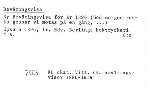//// Beväringsvisa //// Ny Beväringsvisa för år 1896 (God morgon raska gossar vi mötas på en gång, ...) //// Upsala 1896, tr. Edv. Berlings boktryckeri 4 s. 8:o //// 7G3 okat. Vitt. sv. bevärings • //// * ' visor 1880-1939 ////