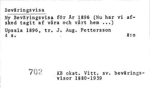 //// Beväringsvisa //// Ny Beväringsvisa för Ar 1896 (Nu har vi af-sked tagit af våra och vårt hem ...) //// Upsala 1896, tr. J. Aug. Pettersson 4 s. 8:o //// 702 KB okat. Vitt. sv. bevärings- //// Visor 1880-1939 ////