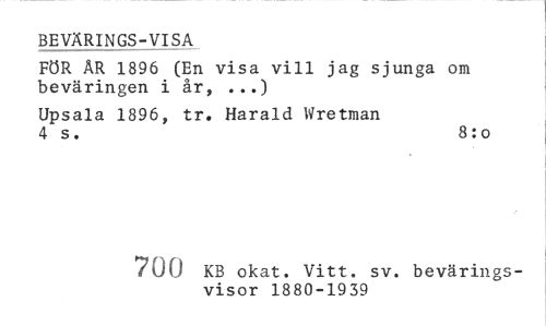 //// BEVÄRINGS-VISA //// FÖR ÄR 1896 (En visa vill jag sjunga om beväringen i år, ...) //// Upsala 1896, tr. Harald Wretman 4 s. 8:o //// 370 KB okat. Vitt. sv. bevärings- //// visor 1800-1879 ////