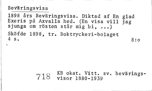 //// Beväringsvisa //// 1898 års Beväringsvisa. Diktad af En glad Exeris på Axvalla hed. (En visa vill jag sjunga om rösten står mig bi, //// Sköfde 1898, tr. Boktryckeri-bolaget 4 s. 8:o //// KB okat. Vitt. sv. bevärings- //// 'vJ4k visor 1880-1939 ////