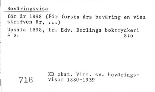 //// Beväringsvisa //// för år 1898 (För första års beväring en visa skrifven är, ...) //// Upsala 1898, tr. Edv. Berlings boktryckeri j 4 s. 8:o //// KB okat. Vitt. sv. bevärings- //// 'vJ4k visor 1880-1939 ////