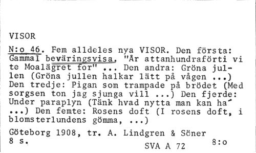 //// VISOR //// N:o 46. Fem alldeles nya VISOR. Den första: Gammal beväringsvisa.. "År attanhundraförti vi te Moalägret for" ... Den andra: Gröna jullen (Gröna jullen halkar lätt på vågen Den tredje: Pigan som trampade på brödet (Med sorgsen ton jag sjunga vill ...) Den fjerde: Under paraplyn (Tänk hvad nytta man kan ha" ...) Den femte: Rosens doft (I rosens doft, i blomsterlundens gömma, ...) //// Göteborg 1908, tr. A. Lindgren & Söner //// 8 s. SVA A 72 8:0 ////
