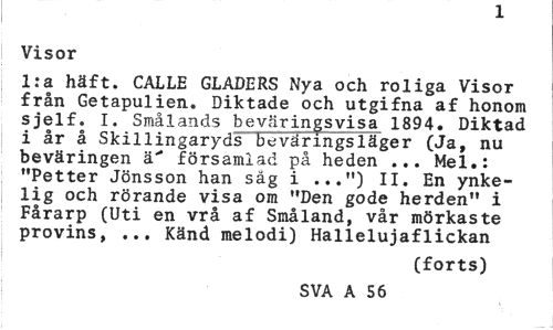 //// X //// Visor //// l:a häft. CALLE GLADERS Nya och roliga Visor från Getapulien. Diktade och utgifna af honom sjelf. I. Smålands beväringsvisa 1894. Diktad i år å Skillingaryds Feväringsläger (Ja, nu beväringen ä" församlad på heden ... Mel.: "Petter Jönsson han såg i ...") II. En ynke-lig och rörande visa om "Den gode herden" i Fårarp (Uti en vrå af Småland, vår mörkaste provins, ... Känd melodi) Hallelujaflickan //// (forts) //// SVA A 56 ////