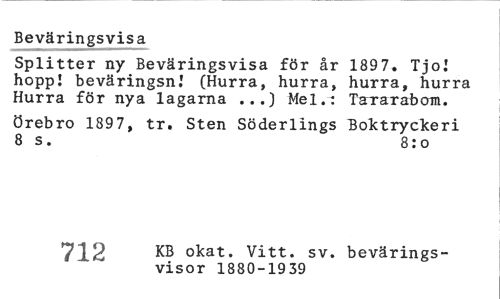 //// Beväringsvisa //// Splitter ny Beväringsvisa för år 1897. Tjol hopp! beväringsnj (Hurra, hurra, hurra, hurra Hurra för nya lagarna ...) Mel.: Tararabom. //// Örebro 1897, tr. Sten Söderlings Boktryckeri 8 s. 8:o //// 370 KB okat. Vitt. sv. bevärings- //// visor 1800-1879 ////
