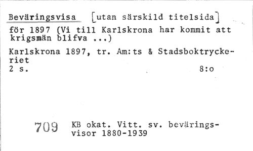 //// Beväringsvisa [utan särskild titelsida] //// för 189 7 (Vi till Karlskrona har kommit att krigsmän blifva ...) //// Karlskrona 1897, tr. Am:ts & Stadsboktryckeriet //// 2 s. 8:o //// 7HQ KB okat. Vitt. sv. bevärings- //// ' ¦ visor 1880-1939 ////
