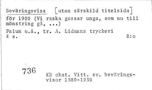 //// Beväringsvisa [utan särskild titelsida] //// för 1900 (Vi raska gossar unga, som nu till mönstring gå, ...) //// Falun u.å., tr. A. Lidmans tryckeri 4 s. 8:0 //// 736 //// KB okat. Vitt. sv. bevärings- //// visor 1880-1939 ////