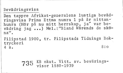 //// Bevädringsvisa //// Den tappre Afrikat-generalens lustiga bevädringsvisa Prima Ettma numra 1 på år nittan-hunra (Hör på nu mitt herrskap, ja" var be-vädring jag ...) Mel.:"Bland Wärends de sköna". //// Filipstad 1900, tr. Filipstads Tidnings Boktryckeri //// 4 s. 8:o //// ?70CC KB okat. Vitt. sv. bevärings- //// » 00 visor 1880-1939 ////