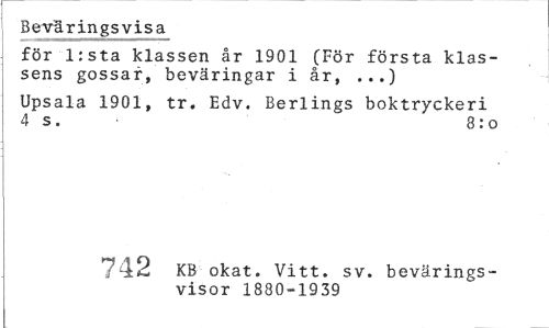 //// Beväringsvisa //// för l:sta klassen år 1901 (För första klassens gossar, beväringar i år, ...) //// Upsala 1901, tr. Edv. Berlings boktryckeri 4 s. 8: o //// 742 KB okat. Vitt. sv. bevärings- //// visor 1880-19 39 ////