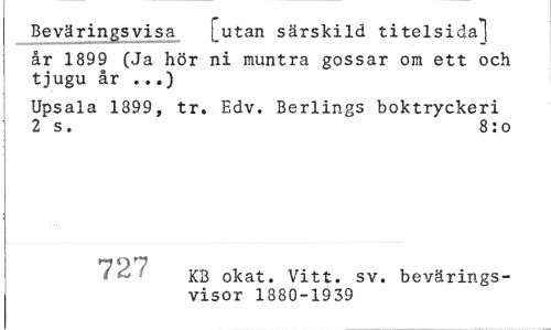 //// Beväringsvisa [utan särskild titelsida*] //// år 1899 (Ja hör ni muntra gossar om ett och tjugu år ...) //// Upsala 1899, tr. Edv. Berlings boktryckeri 2 s. 8:o //// 727 //// KB okat. Vitt. sv. bevärings- //// -__. i n> n i r\ rr r\ //// vxbux iööu-iyo^ ////