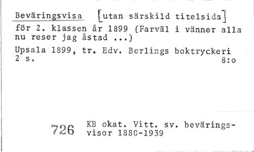 //// Beväringsvisa [utan särskild titelsida"] //// för 2. klassen år 1899 (Farväl i vänner alla nu reser jag åstad ...) //// Upsala 1899, tr. Edv. Berlings boktryckeri 2 s. 8:o //// KB okat. Vitt. sv. bevärings- //// /*db visor 18SC-1939 ////