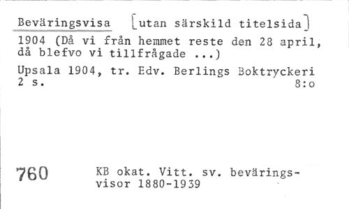 //// Beväringsvisa [utan särskild titelsida! //// 1904 (Då vi från hemmet reste den 28 april, då blefvo vi tillfrågade ___) //// Upsala 1904, tr. Edv. Berlings Boktryckeri 2 s. * 8:o //// 7CQ KB okat. Vitt. sv. bevärings- //// 1 u visor 1880-1939 ////