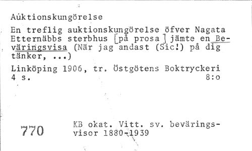 //// Auktionskungörelse //// En treflig auktionskungörelse öfver Nagata Etternäbbs sterbhus [på prosa ] jämte en Be~ , väririgsvisa (När jag andas t (Sid) på dig tänker, .,.) //// Linköping 1906, tr, östgötens Boktryckeri 4 s. 8:0 //// KB okat. Vitt. sv, bevärings- //// 7/U visor 1880-1939 ////