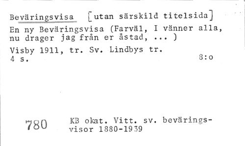 //// Beväringsvisa [utan särskild titelsida] //// En ny Beväringsvisa (Farväl, I vänner alla, nu drager jag från er åstad, ... ) //// Visby 1911, tr. Sv. Lindbys tr. 4 s. 3:o //// >-jgn KB okat. Vitt. sv. bevärings- //// »ÖU visor 1880-19 39 ////