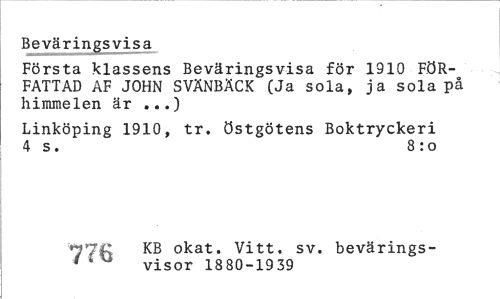 //// Beväringsvisa //// Första klassens Beväringsvisa för 1910 FÖRFATTAD AF JOHN SVÄNBÄCK (Ja sola, ja sola på himmelen är ...) //// Linköping 1910, tr. östgötens Boktryckeri 4 s. 8 :o //// KB okat. Vitt. sv. bevärings- //// ' 1 visor 18 80-19 39 ////