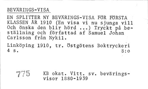 //// BEVÄRINGS-VISA //// EN SPLITTER NY BEVÄRINGS-VISA FÖR FÖRSTA KLASSEN ÄR 1910 (En visa vi nu sjunga vill Och önska den blir hörd'...) Tryckt på beställning och författad af Samuel Johan Carlsson från Nykil. //// Linköping 1910, tr. Östgötens Boktryckeri 4 s . 8: o //// /5»3 okat. Vitt. sv. bevärings- //// visor 1880-1939 ////