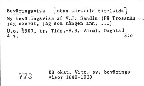 //// Beväringsvisa [utan särskild titelsida \ //// Ny beväringsvisa af V.J. Sandin (På Trossnäs jag exerat, jag som mången ann, ...) //// U.o. 1907, tr, Tidn.-A.B. Värml. Dagblad 4 s. 8:0 //// KB okat. Vitt. sv. bevärings- //// /*db visor 18SC-1939 ////