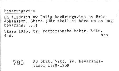 //// Beväringsvisa //// En alldeles ny Rolig Beväringsvisa av Eric Johansson, Skara (Här skall ni höra cm en ung beväring. ...) //// Skara 1913, tr. Pettersonska Boktr. Eftr. 4 s. 8:0 //// 7QH okat. Vitt. sv. bevärings- //// ' visor 1880-1939 ////