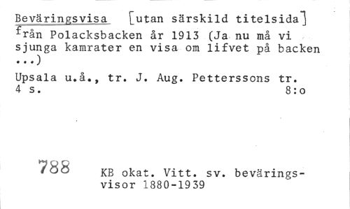 //// Beväringsvisa [utan särskild titelsida] //// ^rån Polacksbacken år 1913 (Ja nu må vi sjunga kamrater en visa om lifvet på backen //// Upsala u.å., tr. J. Aug. Petterssons tr. 4 s. 8:0 //// 788 //// KB okat. Vitt. sv. bevärings- //// visor 1880-1939 ////