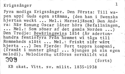 //// Krigssånger 1 //// Fyra modiga Krigssånger. Den Första: Till wa-pen upp! Guds egen stämma, (den han i Swenska hjertan weckt ... Mel.: Marseljäsen) Den Andra: När Konung Oscar låter höra (Befallningen, ... Mel.: Som söner af det gamla Norden ...) Den Tredje: Bewäringswisa 1854 (År aderton-hundra femtiofyra Från hemmet wi tåga till Rommeheds slätt ... Mel.: Friskt slår -wårt hjerta ...) Den Fjerde: Fort tappra kompani, (framåt i munter gång! ... Sjunges på sin egen melodi). Melodierne utföras serskildt wid //// 30$ (forts) //// KB okat. Vitt. sv. milit. 1835-1938 ////