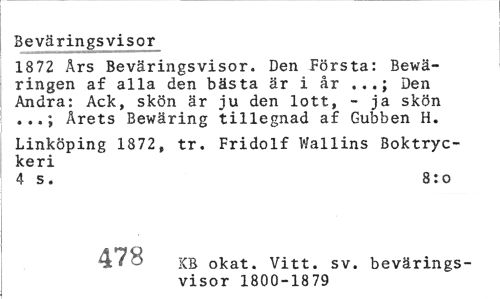 //// Beväringsvisor //// 1872 Års Beväringsvisor. Den Första: Bewä-ringen af alla den bästa är i år ...; Den Andra: Ack, skön är ju den lott, - ja skön ...; Årets Bewäring tillegnad af Gubben H. //// Linköping 1872, tr. Fridolf Wallins Boktryckeri //// 4 s. 8:o //// A*yry KB okat. Vitt. sv. bevärings- //// visor 1800-1879 ////