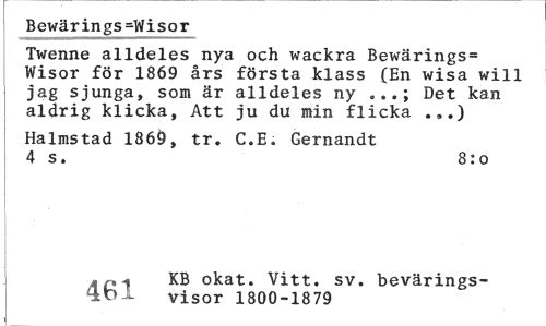 //// Bewärings=Wisor //// Twenne alldeles nya och wackra Bewärings= Wisor för 1869 års första klass (En wisa will jag sjunga, som är alldeles ny Det kan //// aldrig klicka, Att ju du min flicka .„.) //// Halmstad 1869, tr. C.E. Gernandt 4 s. 8:o //// ,n KB okat. Vitt. sv. bevärings- //// otbl visor 1800-1879 ////