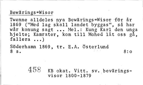 //// Twenne alldeles nya Bewärings=Wisor frör år 1869 ("Med lag skall landet byggas", så har wår konung sagt ... Mel.: Kung Karl den unga hjelte; Kamrater, kom till Mohed låt oss ga, fallera ...) //// Söderhamn 1869, tr. E.A. österlund 8 s. 8:o //// 742 KB okat. Vitt. sv. bevärings- //// visor 1880-19 39 ////