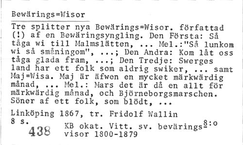 //// Bewärings=Wisor //// Tre splitter nya Bewärings=Wisor. författad (!) af en Bewäringsyngling. Den Första: Så tåga wi till Malmslätten, ... Mel.:"Så lunkom wi så småningom", ...; Den Andra: Kom låt oss tåga glada fram, ...; Den Tredje: Swerges land har ett folk som aldrig swiker, ... samt Maj=Wisa. Maj är äfwen en mycket märkwärdig månad, ... Mel.: Mars det är då en allt för märkwärdig månad, och Björneborgsmarschen. Söner af ett folk, som blödt, ... //// Linköping 1867, tr. Fridolf Wallin //// 8 s* <Jt KB okat. Vitt. sv. bevärings-'0 //// HtCC visor 1800-1879 ////