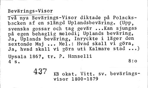 //// Bevärings-Visor //// Två nya Bevärings-Visor diktade på Polacksbacken af en slängd Uplandsbeväring. (Upp, svenska gossar och tag gevär ...Kan sjungas på egen behaglig melodi; Uplands beväring, Ja, Uplands beväring, Inryckte i läger den sextonde Maj ... Mel.: Hvad skall vi göra, Ja, hvad skall vi göra uti Kalmare stad ...) //// Upsala 1867, tr. P. Hanselli 4 s. 8:0 //// KB okat. Vitt. sv. bevärings- //// visor 1800-1879 ////