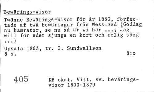 //// *Bewärings=Wisor //// Twänne Bewärings=Wisor för år 1863, författade af twå bewäringar från Wessland (Goddag nu kamrater, se nu så är wi här Jag //// will för eder sjunga en kort och rolig sång //// Upsala 1863, tr. I. Sundwallson 8 s. 8:o //// 405 KB okat. Vitt. sv. bevärings- //// visor 1800-1879 ////