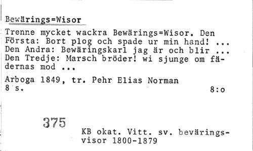//// Bewärings=Wisor //// Trenne mycket wackra Bewärings=Wisor. Den Första: Bort plog och spade ur min hand,' ... Den Andra: Bewäringskarl jag är och blir ... Den Tredje: Marsch bröder! wi sjunge om fädernas mod ... //// Arboga 1849, tr. Pehr Elias Norman 8 s. 8:0 //// 375 //// KB okat. Vitt. sv. bevärings- //// visor 1800-1879 ////