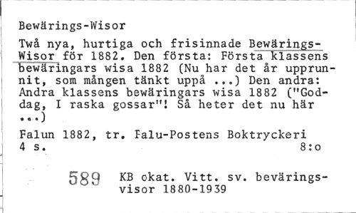 //// Bewärings-Wisor //// Twå nya, hurtiga och frisinnade Bewäringswisor för 1882. Den första: Första klassens bewäringars wisa 1882 (Nu har det år upprunnit, som mången tänkt uppå ...) Den andra: Andra klassens bewäringars wisa 1882 ("Goddag, I raska gossar"! Så heter det nu här //// Falun 1882, tr. Falu-Postens Boktryckeri 4 s. 8:o //// 5gQ KB okat. Vitt. sv. bevärings- //// visor 1880-1939 ////