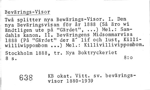 //// Bevärings-Visor //// Twå splitter nya Bewärings-Visor. L. Den nya Beväringsvisan för år 1888 (Så äro wi ändtligen ute på "Gärdet", ...) Mel.: Sandahls kanon. II. Beväringens Midsommarvis a 1888 (På "Gärdet" der ä' lif och lust, Killi-williwippombom ...) Mel.: Killivillivippombom. //// Stockholm 1888, tr. Nya Boktryckeriet 8 s. 8:o //// COO KB okat. Vitt. sv. bevärings- //// visor 1880-1939 ////