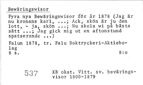 //// Bewäringswisor //// Fyra nya Bewäringswisor för år 1878 (Jag är nu kronans karl, ...; Ack, skön är ;ju den lott, - ja, skön ...; Nu skola wi på bästa sätt ...; Jag gick mig ut en aftonstund spatserande ...) //// Falun 1878, tr. Falu Boktryckeri-Aktiebolag //// 8 s. 8:o //// Cj07 KB okat. Vitt. sv. bevärings- //// °/ visor 1800-1879 ////
