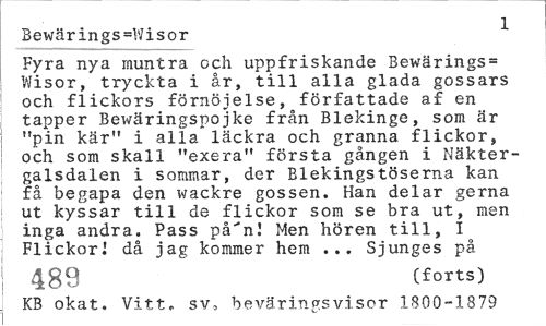 //// Bewärings=Wisor 1 //// Fyra nya muntra och uppfriskande Bewärings= Wisor, tryckta i år, till alla glada gossars och flickors förnöjelse, författade af en tapper Bewäringspojke från Blekinge, som är "pin kär" i alla läckra och granna flickor, och som skall "exera" första gången i Näktergalsdalen i sommar, der Blekings töserna kan få begapa den wackre gossen. Han delar gerna ut kyssar till de flickor som se bra ut, men inga andra. Pass på"n! Men hören till, I Flickor! då jag kommer hem ... Sjunges på //// 489 (forts) //// KB okat. Vitt. sv, beväringsvisor 1800-1879 ////