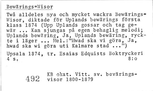 //// Bewäringswisor //// Twå alldeles nya och mycket wackra Betsrärings = Wisor, diktade för Uplands bewärings första klass 1874 (Upp Uplands gossar och tag ge-wär ... Kan sjungas på egen behaglig melodi; Uplands bewäring, Ja, Uplands bewäring, ryckte i läger ... Mel.:"Hwad ska vi göra, Ja, hwad ska wi göra uti Kalmare stad ..,") //// Upsala 1874, tr. Esaias Edquists Boktryckeri 4 s. 8:o //// KB okat. Vitt. sv, bevärings» //// 492 visor 1800-1879 ////