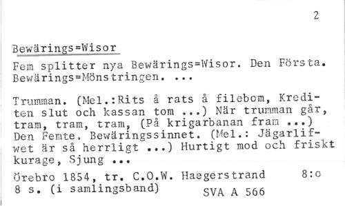 //// 2 //// Bewärings=Wisor //// Fem splitter nya Bewärings=Wisor. Den Första. Bewärings=Mönstringen. ... //// Trumman. (Mel.:Rits å rats å filebom, Krediten slut och kassan tom ...) När trumman går, tram, tram, tram, (På krigarbanan fram ...) Den Femte, Bewäringssinnet. (Mel.: Jägarlif-wet är så herrligt ...) Hurtigt mod och friskt kurage, Sjung ... //// Örebro 1854, tr. C.O.W. Haegerstrand 8:0 //// 8 s. (i samlingsband) SVA A 566 ////