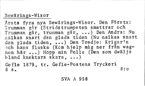 //// Bewärings-Wisor //// Årets fyra nya Bewärings-Wisor. Den Första: Trumman går (Stridstrumpeten smattrar och Trumman går, trumman går, ...) Den Andra: Nu nalkas snart den glada tiden (Nu nalkas snart den glada tiden, ...) Den Tredje: Krigar'n och hans flaska (Kem hjelp mig ner från wag-nen här ...) Hopp min Polle (Den som dwäljs bland knektars skara, ...) //// Gefle 1879, tr. Gefle-Postens Tryckeri //// 8 s.. 8:0 //// SVA A 95 8 ////