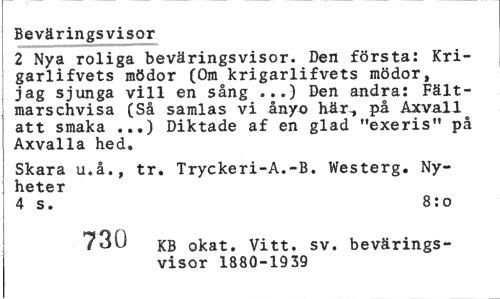 //// Beväringsvisor //// 2 Nya roliga beväringsvisor. Den första: Kri-garlifvets mödor (Om krigarlifvets mödor, jag sjunga vill en sång ...) Den andra: Fältmarschvisa (Så samlas vi ånyo här-, på Axvall att smaka ...) Diktade af en glad "exeris" på Axvalla hed. //// Skara u.å., tr. Tryckeri-A.-B. Westerg. Nyheter //// 4 s. 8:0 //// 730 Kg okat. Vitt. sv. bevärings- //// visor 1880-1939 ////