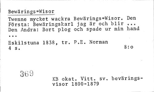 //// Bewärings=Wisor //// Twenne mycket wackra Bewärings=Wisor. Den Första: Bewäringskarl jag är och blir ... //// Den Andra: Bort plog och spade ur min hand • • • //// Eskilstuna 1838, tr. P.E. Norman 4 s. 8:0 //// 363 //// KB okat. Vitt. sv. bevärings- //// visor 1800-1879 ////