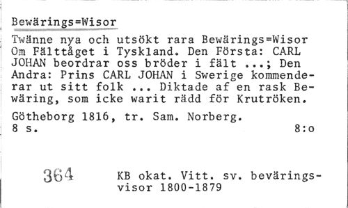 //// Bewärings=Wisor //// Twänne nya och utsökt rara Bewärings=Wisor Om Fälttåget i Tyskland. Den Första: CARL JOHAN beordrar oss bröder i fält .Den Andra: Prins CARL JOHAN i Swerige kommenderar ut sitt folk ... Diktade af en rask Bewäring, som icke warit rädd för Krutröken. //// Götheborg 1816, tr. Sam. Norberg. 8 s. 8:0 //// 364 KB okat. Vitt. sv. bevärings- //// visor 1800-1879 ////