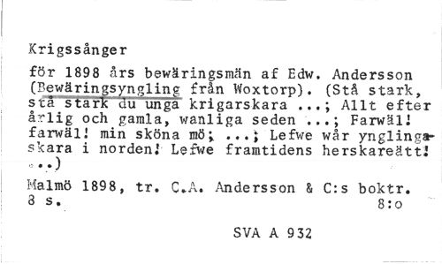 //// Krigssånger //// för 1898 års bewäringsmän af Edw. Andersson (Bewäringsyngling från Woxtorp). (Stå stark, stå stark du unga krigarskara Allt efter //// årlig och gamla, wanliga seden Farwäl! //// farwäl! min sköna mö; Lefwe wår ynglinga- //// skara i norden.' Lefwe framtidens herskareätti //// Malmö 1898, tr. C.A. Andersson & C:s boktr. //// 3 s. 8:o //// SVA A 9 32 ////