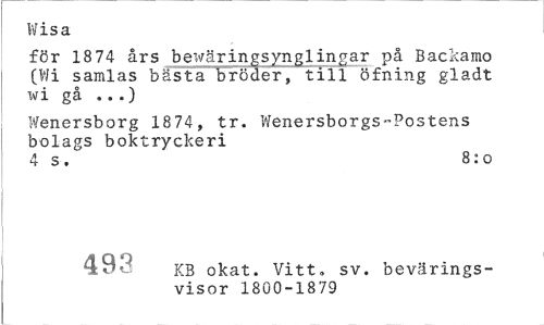 //// Wisa //// för 18 74 års bewäringsynglingår på Backamo (Wi samlas bästa bröder, till öfning gladt wi gå ...) //// Wenersborg 18 74, tr. Wenersborgs-Postens bolags boktryckeri //// 4 s. 8: o //// 493 KB okat. Vitt» sv. bevärings- //// visor 1800-1879 ////